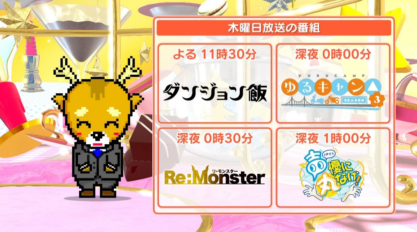 ダンジョン飯 4/4(23:00)ゆるキャン 4/4(23:30)